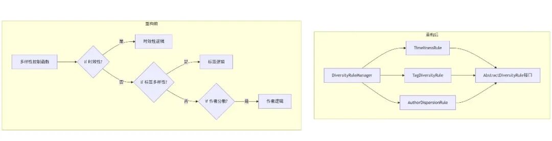 多样性控制是推荐系统关键环节,核心职责是通过多种策略避免内容同质化。 原实现将所有策略判断逻辑耦合在一个巨型函数中,通过大量if-else分支和配置标志位控制策略启用。