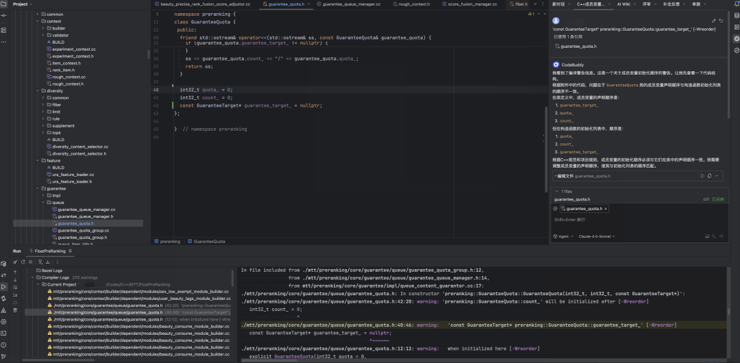 有了可视化的问题呈现和精准的代码定位,修复warning的流程就可以引入AI的力量。用户在日志树中选中一个warning告诉CodeBuddy。CodeBuddy AI会自动分析文件内容,提取警告位置前后的代码上下文,包括函数签名、变量声明,甚至函数的调用链、类的继承关系、模块间的依赖等。这种自动化的上下文理解能力让AI能够在充分掌握代码意图的基础上生成修复方案,并自动应用修改。用户的角色从"执行者"变为"决策者",专注于理解问题和评估方案,而AI负责信息处理、上下文理解和代码修改的执行工作。