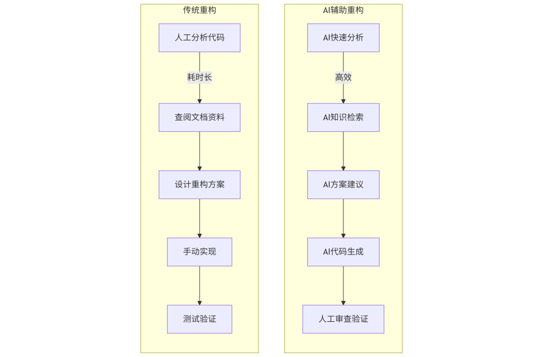 有效性源于三个核心原则。风险递增原则:从低风险函数拆分到中风险模式重构, 最后才是高风险架构调整,失败成本可控。价值递增原则:每个阶段产生可感知改进, 持续正反馈维持重构动力。知识递增原则:局部重构帮助团队深入理解代码库, 积累的经验为后续架构决策提供基础。AI扮演加速器角色,缩短执行时间, 但路径选择和节奏把控由工程师主导。