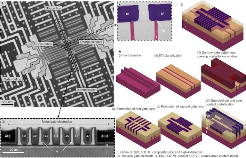 研究人员在论文中描述了他们的新工艺:采用先进的晶体管制造技术(即英特尔最新一代互补金属氧化物半导体 “CMOS”芯片的生产设备)在300mm硅晶片上制造量子比特,并通过全光光刻和全工业处理,在一个位于28Si/28SiO2的接口上实现了量子点以及纳米级门模式。