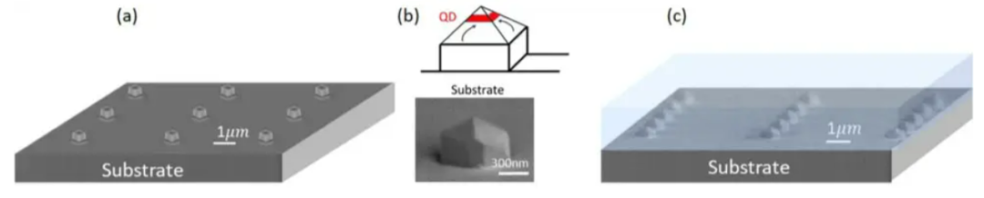 图1.(a)在平面半导体衬底上创建的初始纳米尺寸台面阵列的扫描电子显微镜(SEM)图像;(b)材料沉积过程中台面轮廓演变示意图,黑色箭头表示原子迁移方向,首先导致GaAs尺寸减小(SESRE方法),量子点材料InAs(红色)在尺寸减小的台面顶部沉积,然后返回GaAs以掩埋红色InAs;带有单个量子点台面的SEM图像如下图所示;(c)表示埋在平面化GaAs表面下的量子点阵列,GaAs是不透明的,为便于观察,图中覆盖层显示为半透明。(图片来源:网络)