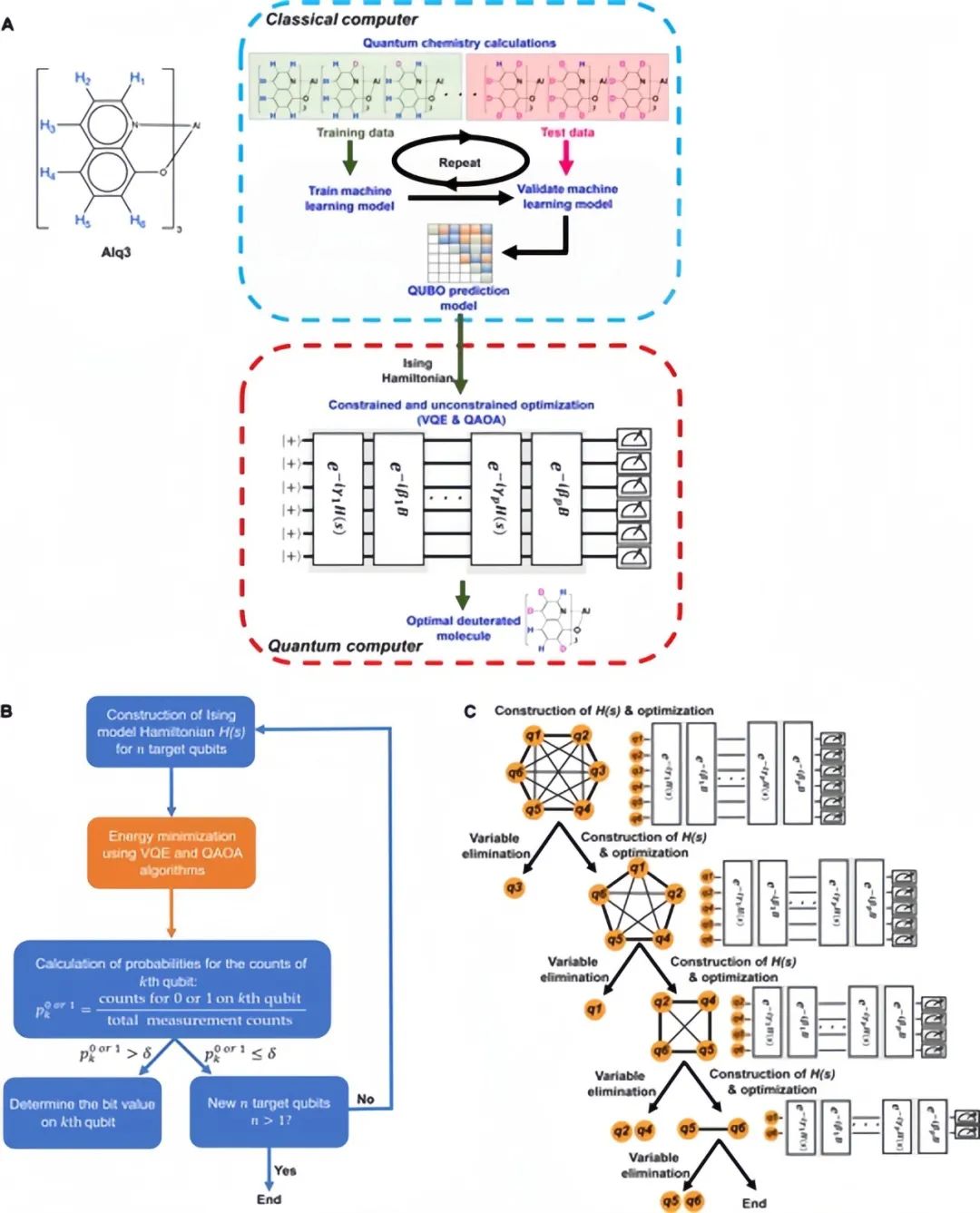 (A)Alq₃的结构;(B)两种量子优化算法的流程图;