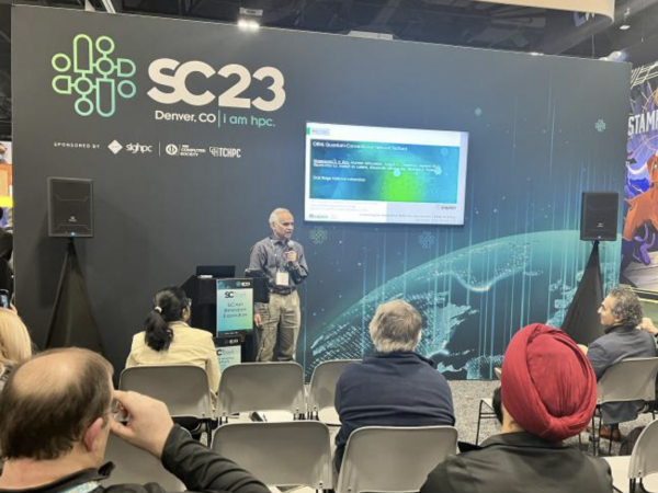 美国橡树岭国家实验室的Nagi Rao讲解实验室在丹佛2023年超级计算大会(SC23)部署的用于量子网络的“暗光纤”测试台。(图片来源:网络)
