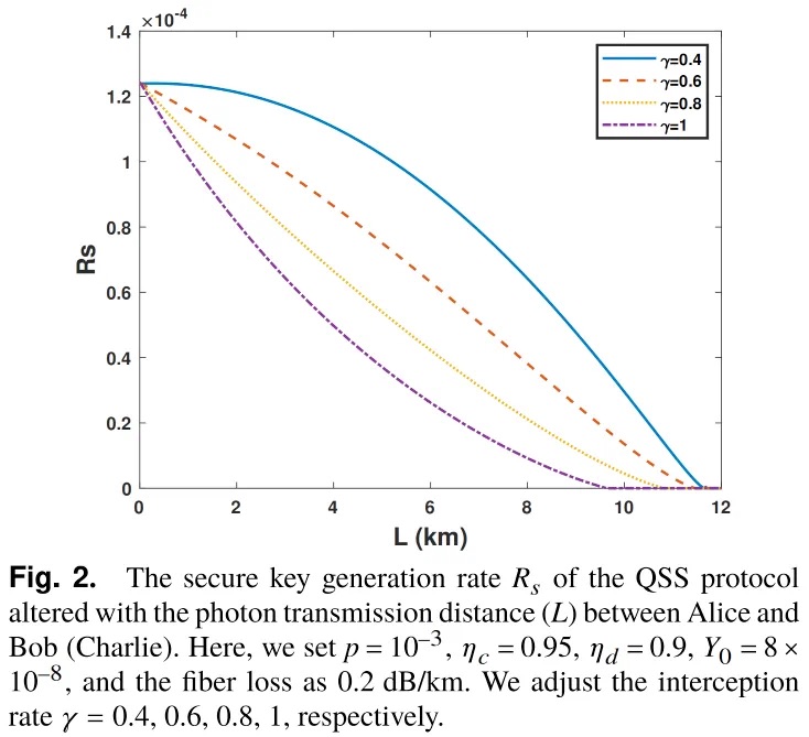 QSS协议的安全密钥生成率随Alice和Bob之间的光子传输距离而变化(图源论文)
