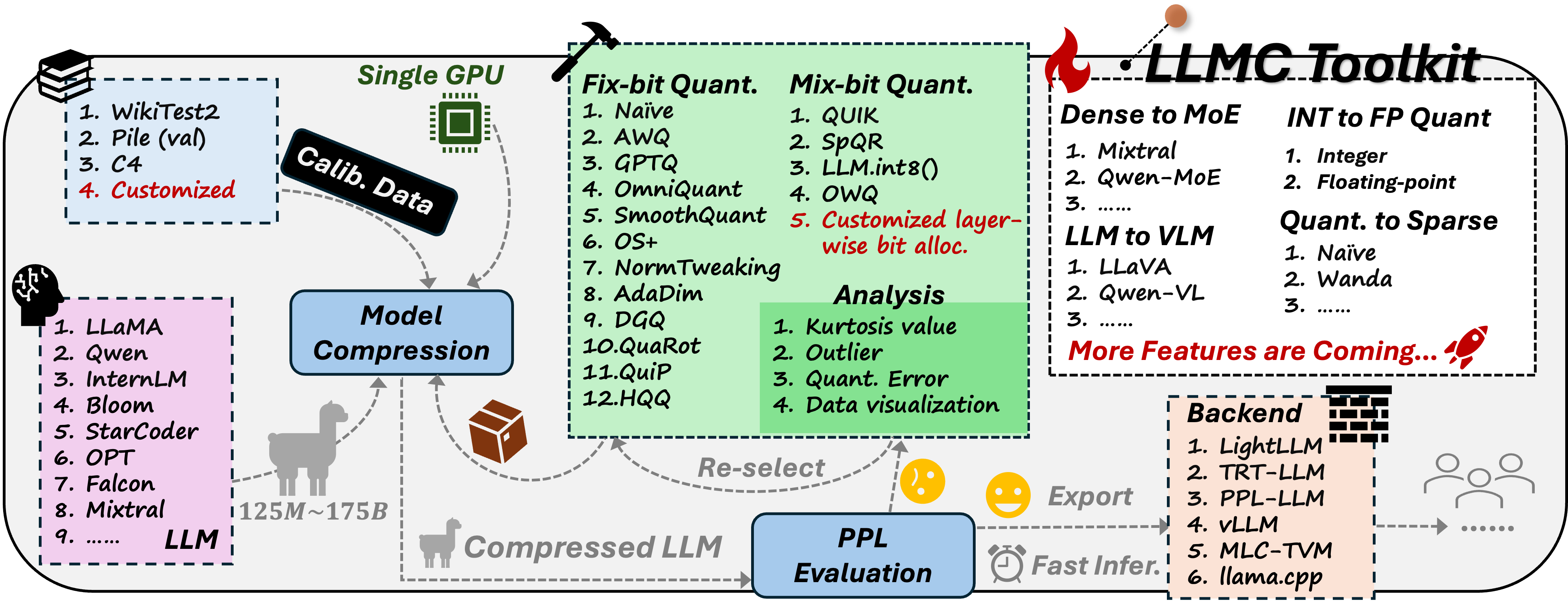 来自北航、商汤、南洋理工等团队联合推出的大模型压缩工具与基准LLMC,一个即插即用的压缩工具包,以公平、系统地探索量化的影响。 LLMC 集成了数十种算法、模型和硬件,提供了从整数到浮点量化、从 LLM 到视觉语言(VLM)模型、从固定位到混合精度、从量化到稀疏化的高度可扩展性。