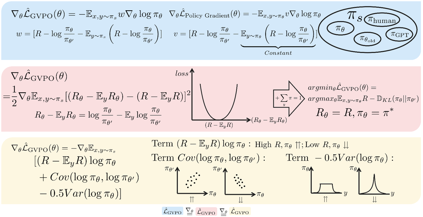 - 蓝色部分。我们从梯度权重 w 出发设计了GVPO loss,通过与policy gradient对比,体现了GVPO具有采样丰富性的优势。