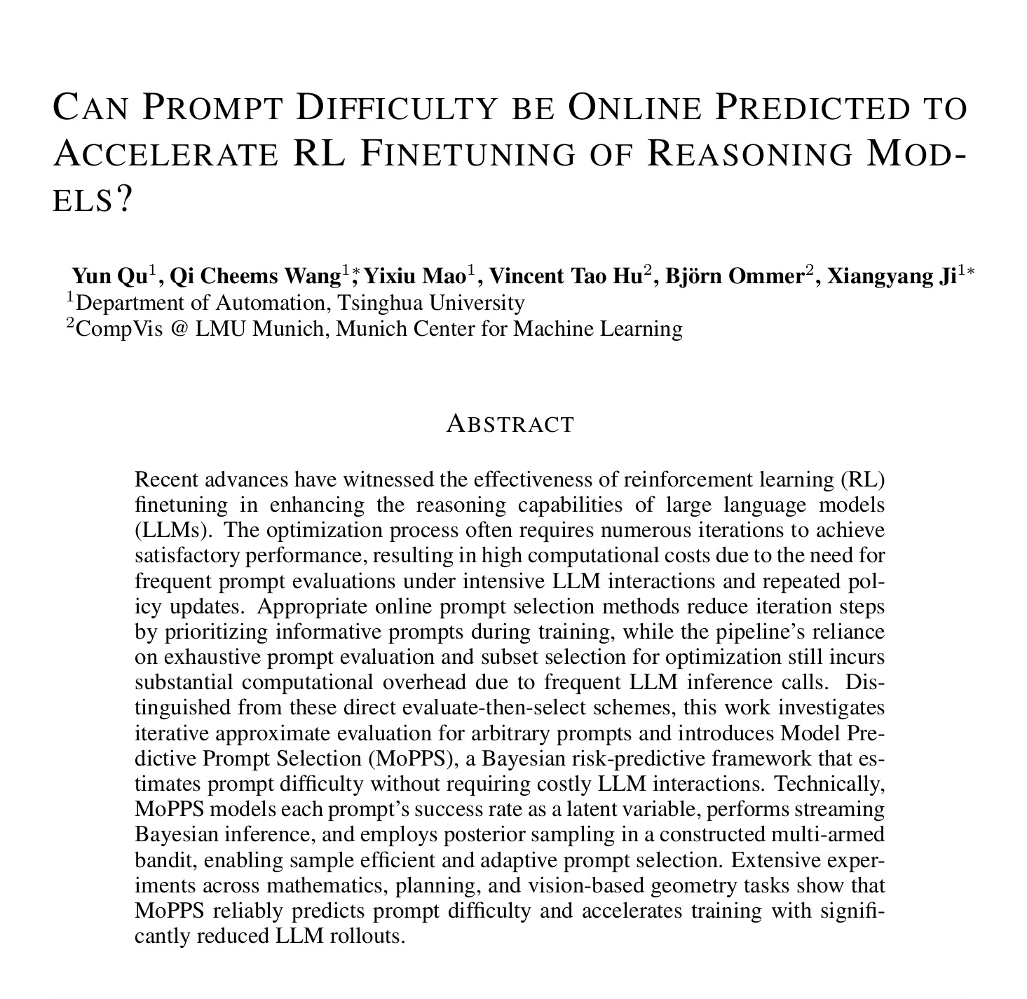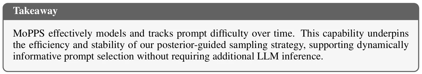 在数学、规划、以及基于视觉的几何任务上的大量实验证明,MoPPS能够稳定地预测提示难度,并显著减少LLM推理次数,从而加快训练速度。