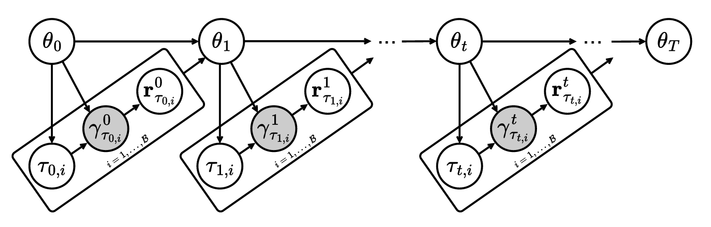 图 3:LLM 强化学习微调的概率图模型。奖励信号 r τ t , i t {r}^t_{\tau_{t,i}} rτt,it 是一组对 k k k 个生成响应进行评估的二值值,由潜在的成功率 γ τ t , i t \gamma^t_{\tau_{t,i}} γτt,it 所决定。提示批次 { τ t , i } i = 1 B \{\tau_{t,i}\}_{i=1}^{\mathcal{B}} {τt,i}i=1B 是根据当前的 LLM θ t \theta_t θt 按照特定准则选取的。图中的白色节点表示观测变量,灰色节点表示潜在变量。