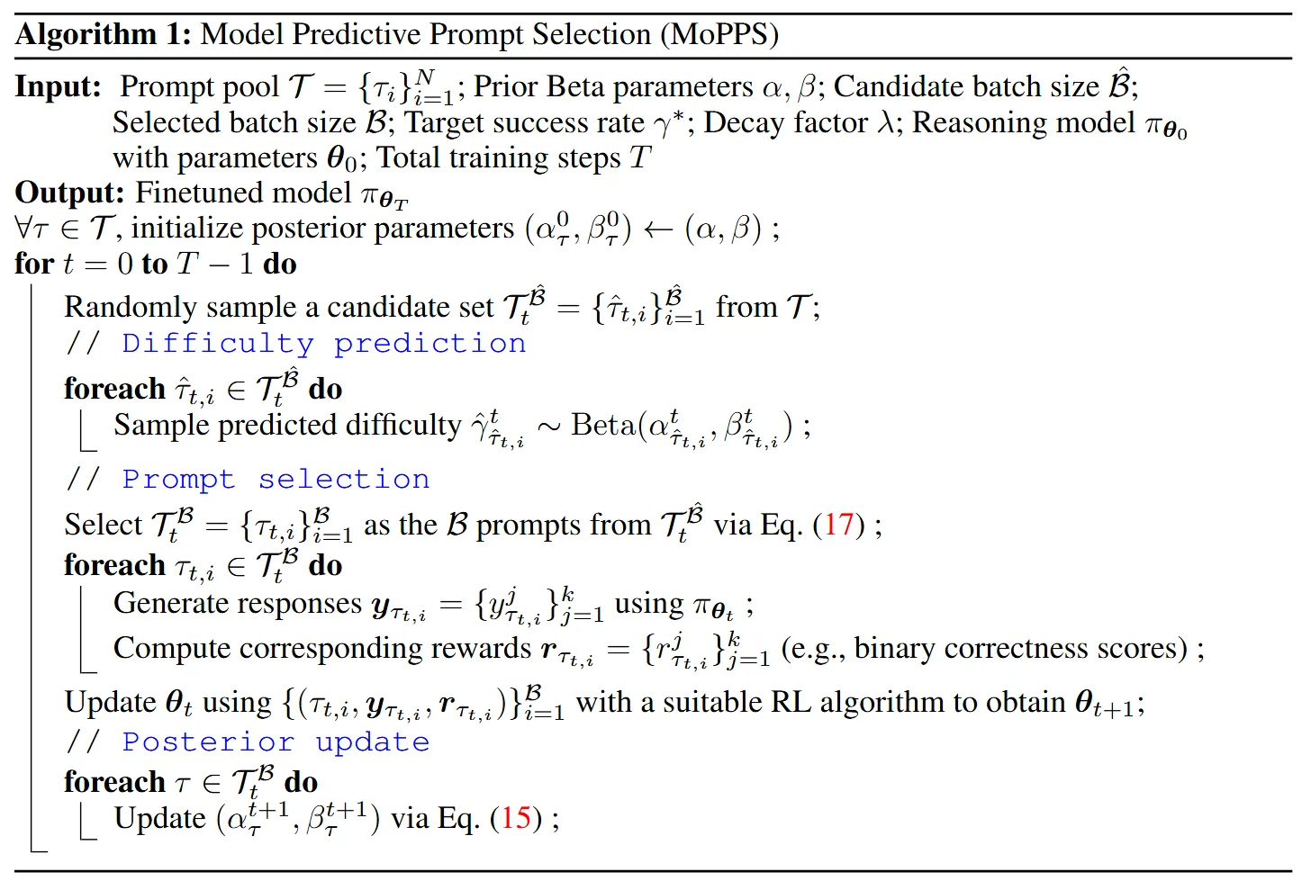 该方法在保持计算效率的同时,鼓励探索,并保留了优先选择对学习最有益提示的能力。算法 1 展示了所提出的 MoPPS 方法,该方法可无缝集成到任何强化学习微调算法中。
