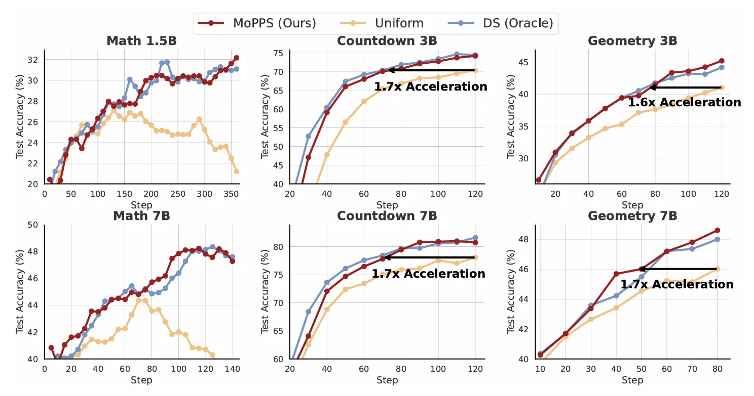 在数学、规划和几何等多种推理任务上的实验结果表明,MoPPS 在训练效率上显著优于均匀提示选择,并能达到或超越依赖评估的主流方法,同时大幅减少了 LLM rollout 成本。