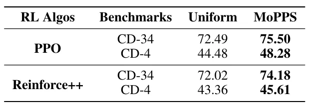 表 2:我们在 Countdown 任务上对比了 Uniform 与 MoPPS 在使用 PPO 和 Reinforce++ 两种算法下的表现。MoPPS 在 Countdown-34 和 Countdown-4 上均稳定实现了更高的 pass@1 准确率。