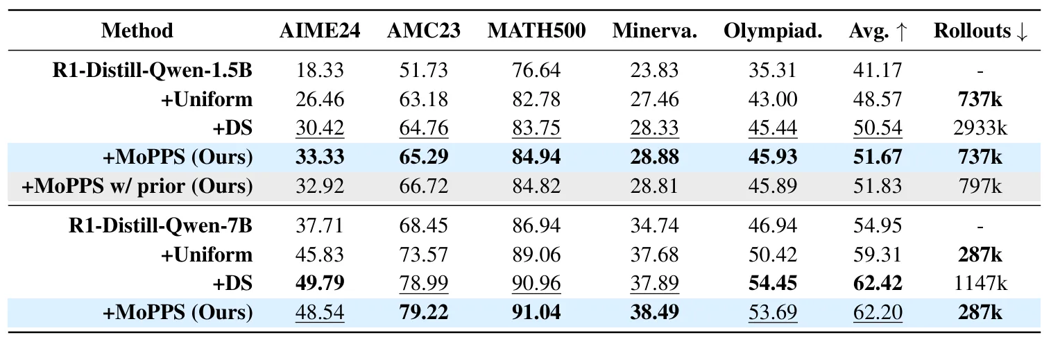 表 1:数学任务的评估结果。“Minerva.” 和 “Olympiad.” 分别指 Minerva Math 和 OlympiadBench;“+” 表示使用相应方法进行微调。准确率为每个问题独立生成 16 次响应后的 pass@1 平均值。“Avg.” 表示在所有基准测试上的平均准确率;“Rollouts” 表示微调过程中生成的样本总数。加粗表示最优结果,下划线表示次优结果。“MoPPS w/prior” 表示在 MoPPS 中融合了先验知识。