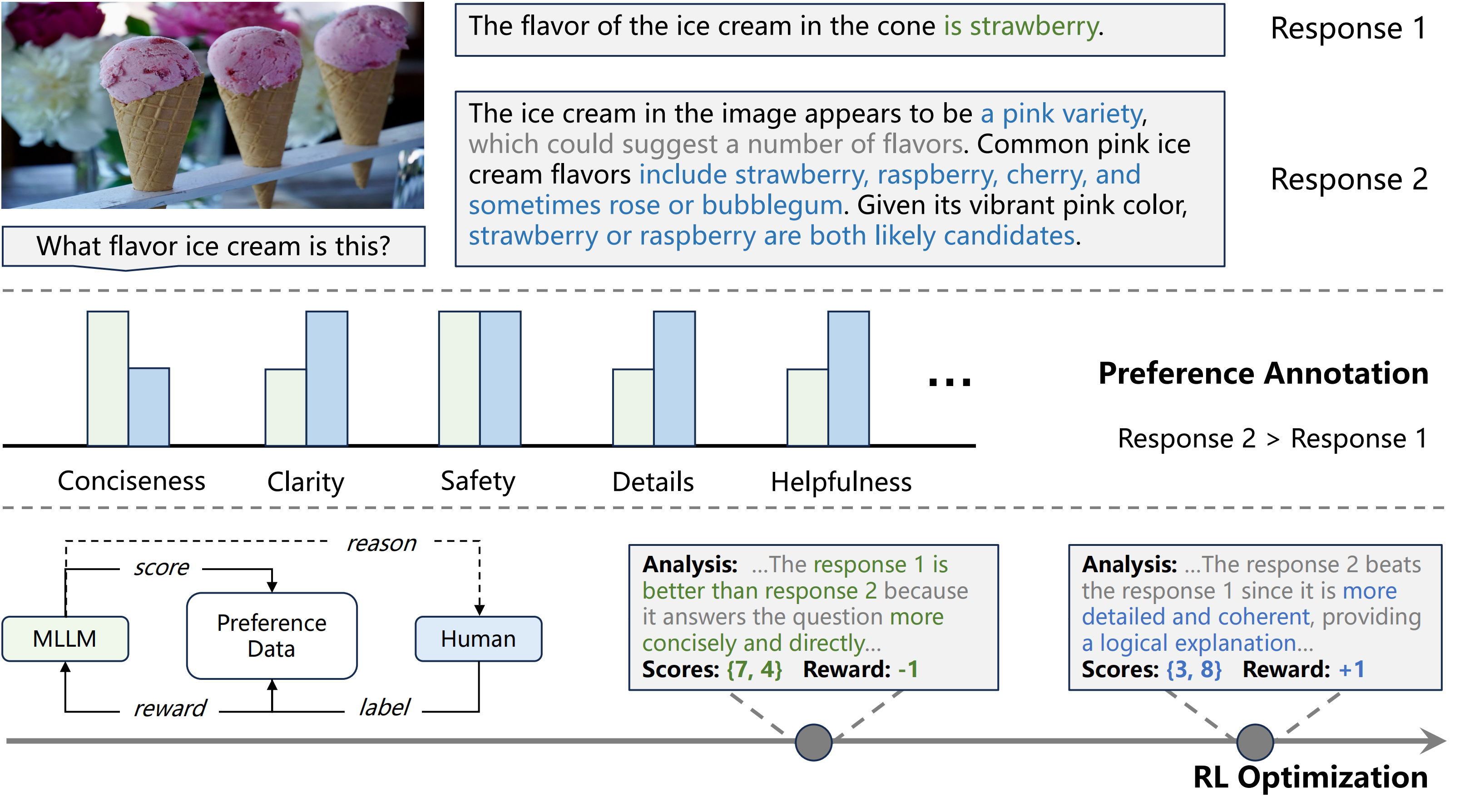 训练与人类意图对齐的多模态大模型是一个长期挑战。传统的基于分数的奖励模型在强化学习(RLHF)中存在准确性低、泛化性弱和可解释性差等问题。