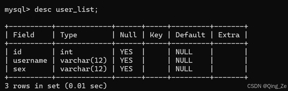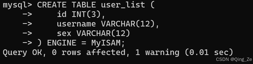 三、在 student 数据库中创建 user_list 数据表,该表使用 MyISAM 引擎,该表定义了三个字段,