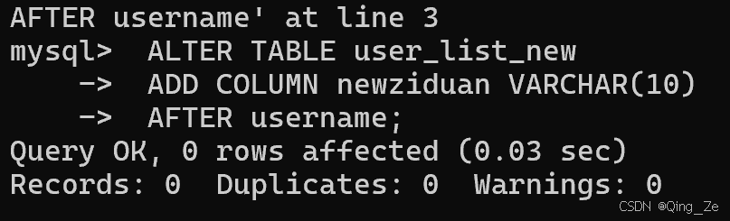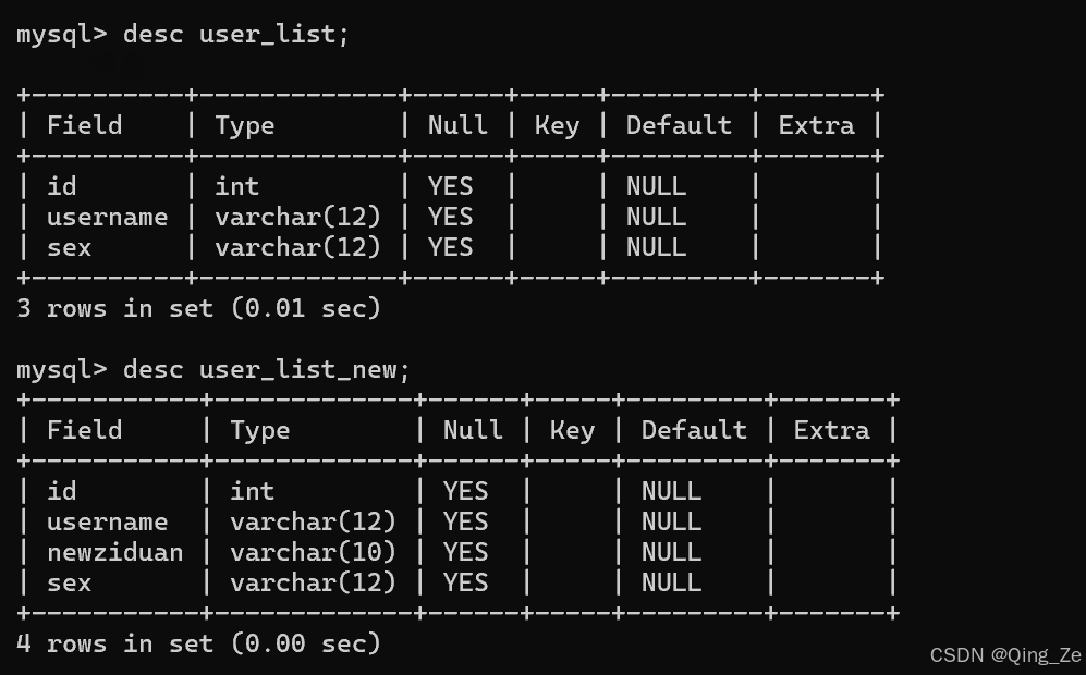 五、在 user_list_new 表中增加新字段,该字段位于 username 字段和 sex 字段中间,该字段数据类型要求为 varchar(10)。