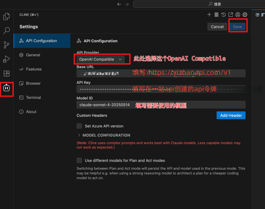 如果说 VS Code 是 “基础装备”,那Cline 插件就是 “神级 buff”—— 它能把 AI 大模型(比如 “一站 API”)直接集成到 VS Code 里,实现 “对话式编程”,核心功能帮你解决开发痛点: