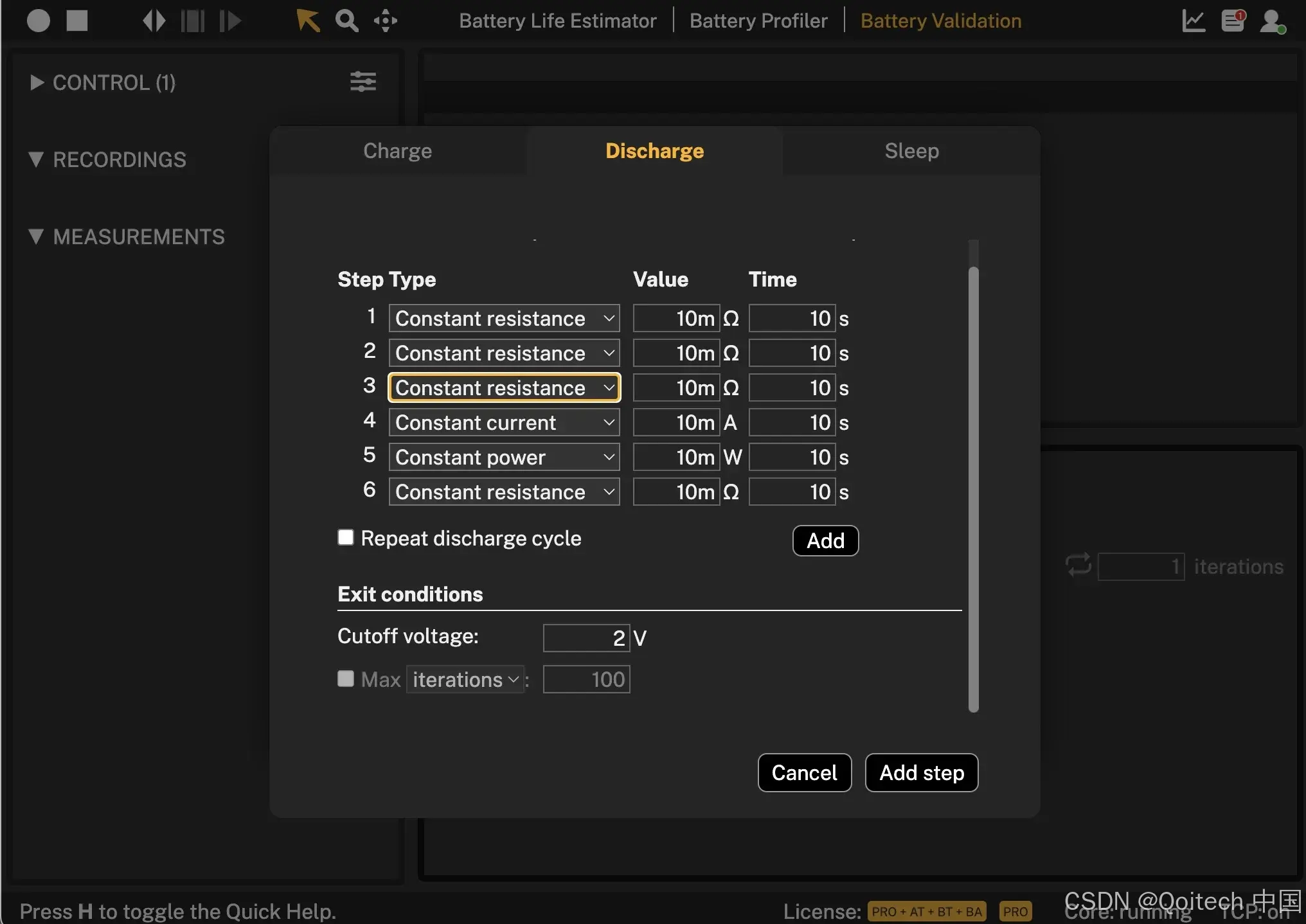 步骤二:配置电池验证。在 Otii 桌面应用程序的工具栏中选择“电池验证(Battery Validation)”。点击“添加步骤(Add Step)”,系统将提供创建自定义循环配置文件的选项,允许用户设定充电、放电和待机步骤,并定义所需的退出条件和时间。