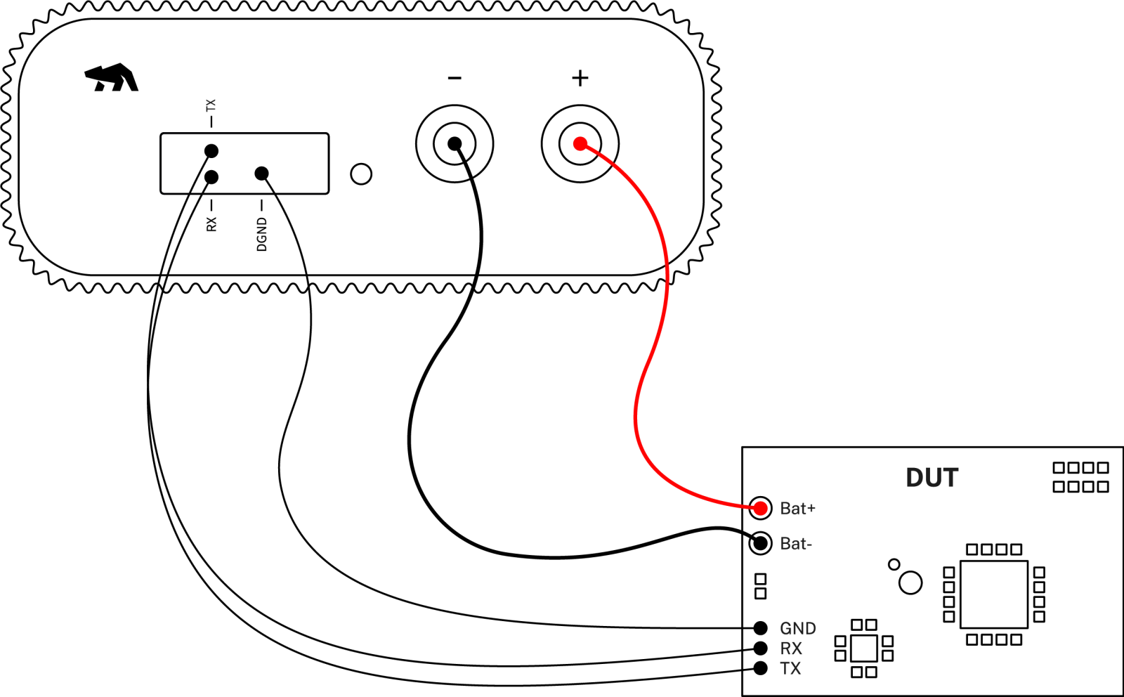 - (可选)从被测设备的接地GND,连接到Otii Ace的DGND端。该步骤仅针对Otii Ace,原因是扩展端口和香蕉插头是互相隔离的。