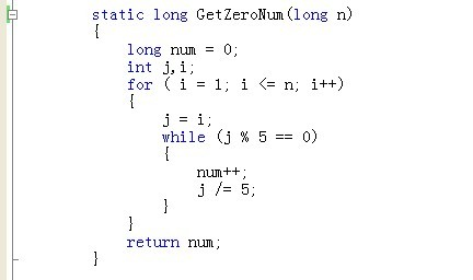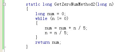 那到底有没有更好的算法呢?我们来分析,N!能产生0的质数组合只能是2 * 5,也就是说当对N!进行质数分解之后,N!末尾0的个位M取决于2的个数X和5的个数Y的最小值,即M = min(X,Y)。又因为能被2整除的数出现的频率比能被5整除的数高得多,且出现一个5的时,最少会同时出现一个2,所以M = Y。即得出Y的值就可以得到N!末尾0的个数。