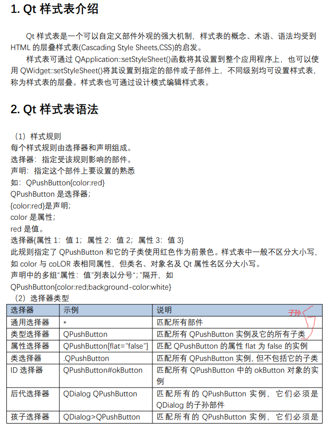 从 Qt4.3 开始,任何可设计的 Q_PROPERTY 都可以使用“qproperty-属性名称”语法来设置样 式表。如: