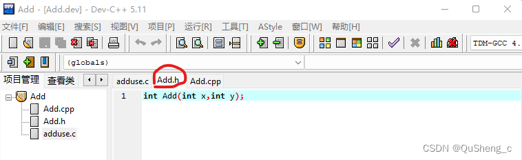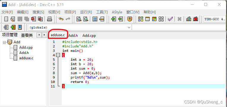 三,再新建一个文件,编写调用Add的主函数,保存为adduse.cpp