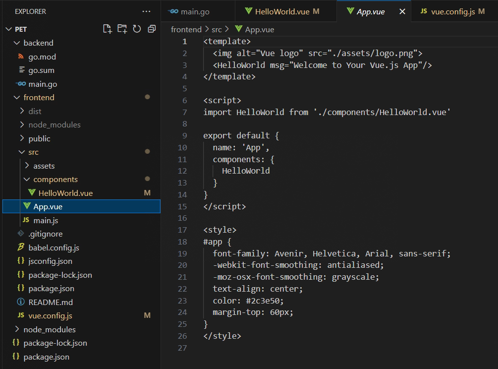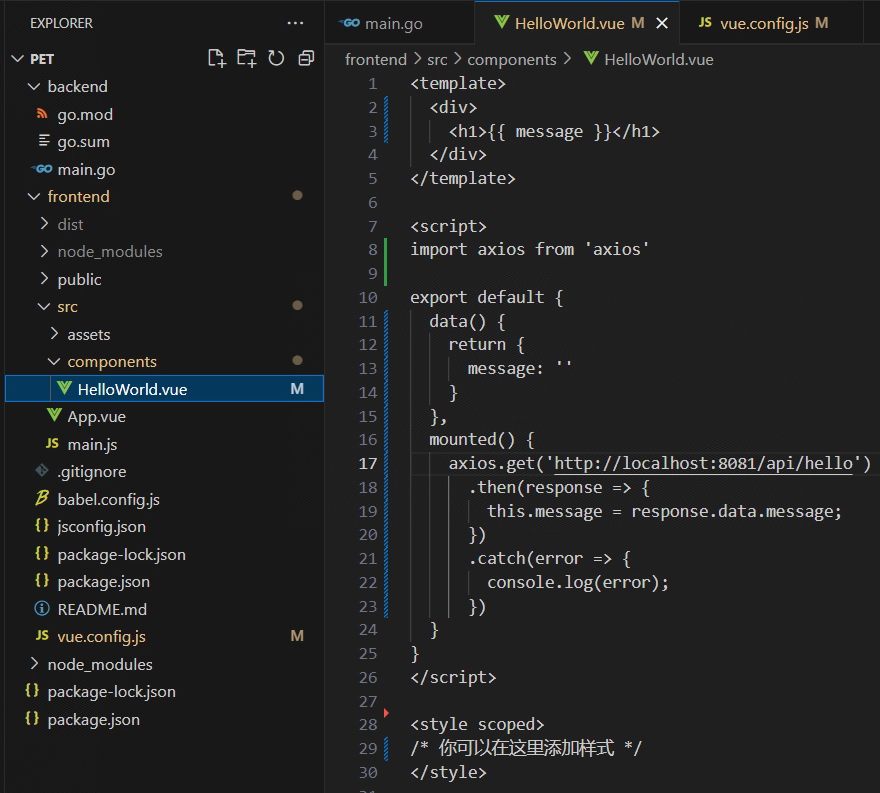 其中图标是在app.vue中,components中的hello from gin也有了。