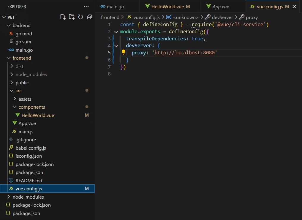 在 vue.config.js 中设置代理,将前端的请求转发到后端: