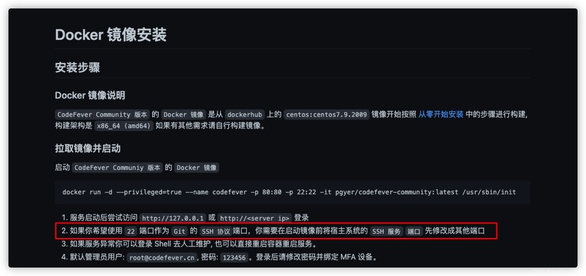 那么如果我们Codefever Community使用22端口的话,那么宿主机的22端口就需要释放出来,不然的话他可能就会冲突,所以建议大家先把宿主的22端口改成别的,这样一会直接跑上面的命令就好啦。