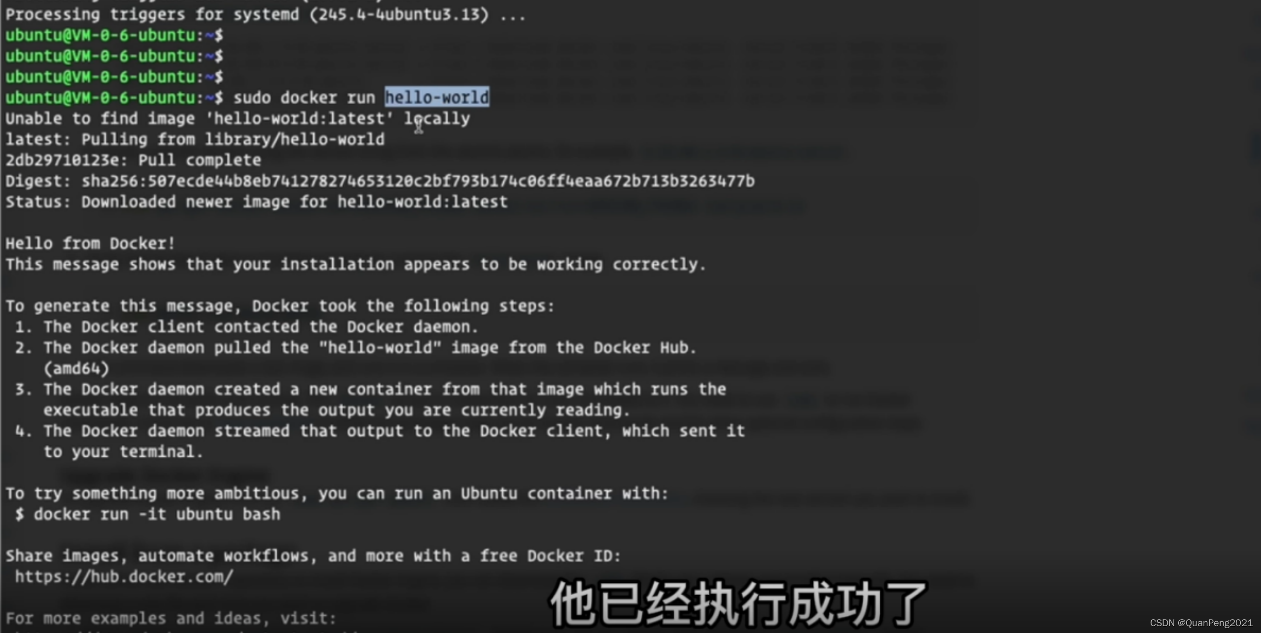 安装完成后,使用sudo docker run hello-world尝试运行。