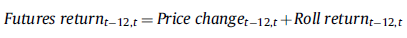 价格由最近到期的期货价格衡量,无风险收益为过去 12 个月的无风险收益,借此我们定义展期收益(Roll return)为: