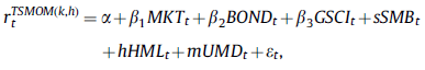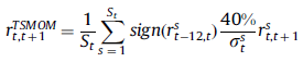 对于每种标的 S,在每一个月 t,我们计算过去 k 月它的超额收益的正负情况,若为正则开多仓,若为负则开空仓,并持仓 h 月。每月我们把持仓规模设定与预估波动率成反比,即