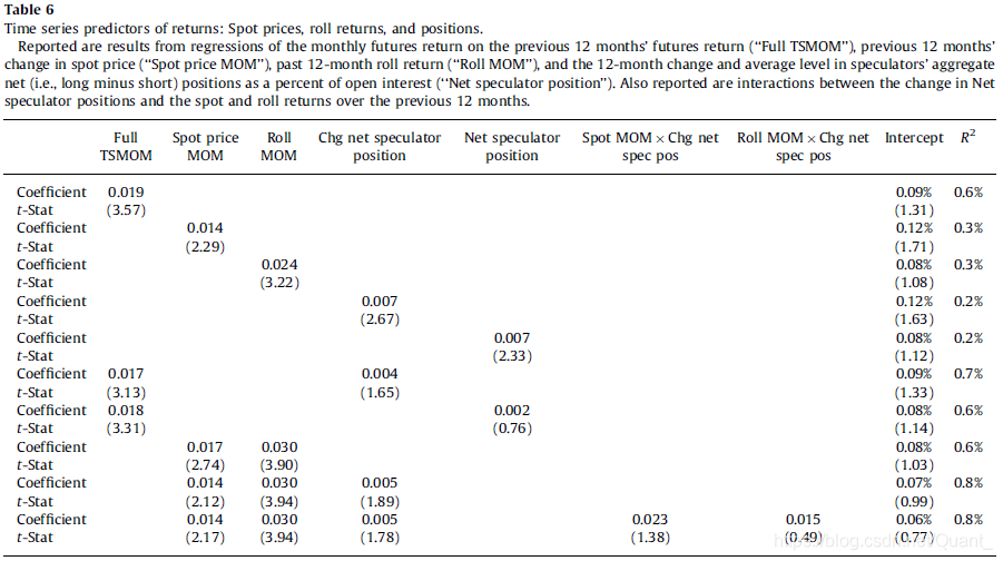 时间序列动量的获利能力的一种可能的解释是,投机者通过给对冲者提供流动性获利。下面我们进一步研究交易持仓和期货收益的来源对收益预测的影响。特别地,我们研究了现货价格或者说期货展期收益对时间序列动量预测能力的贡献,以及它们和交易持仓之间的关系。