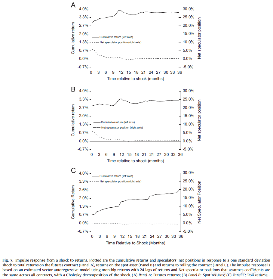 我们的推测是,展期收益主要受对冲者的价格压力影响,而现货价格变化主要受信息传播影响。图 7 的 B 图是利用我们之前提到的 VAR 模型画出的现货价格变化和投机者净持仓的应激反应曲线(与 A 图相比仅是将期货价格曲线改为现货价格曲线)。其曲线与 A 图几乎一样,同样印证了趋势持续大约 1 年并在之后反转的现象。图 7 的C图又将现货价格收益曲线替换为展期收益曲线,这回曲线与之前完全不同。对于展期收益的冲击是展期收益持续上升并且对投机者净持仓几乎没有影响。这和投机者愿意放弃展期收益而享受对冲利益有关,而为对冲者提供流动性的投机者借此获利。