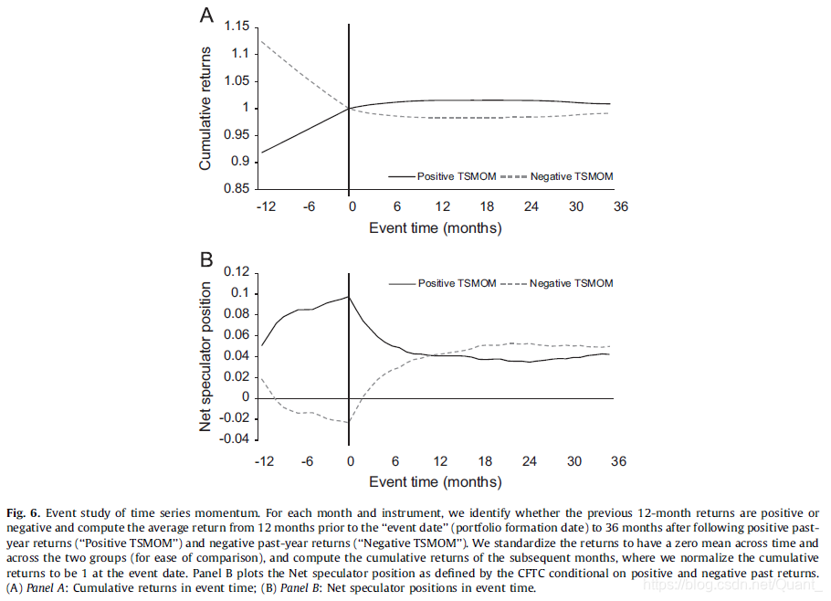 图 6 的 A 图展示了在正的和负的时间序列动量下的累计收益曲线。当前时间左侧,如定义,正组合曲线显然呈上升趋势,负组合曲线呈下降趋势。当前时间右侧,我们可以看到正组合曲线仍会再上升 1 年左右然后略微反转。这和情绪理论里的初期反应不足和延迟的过度反应一致。负组合曲线情况也类似。