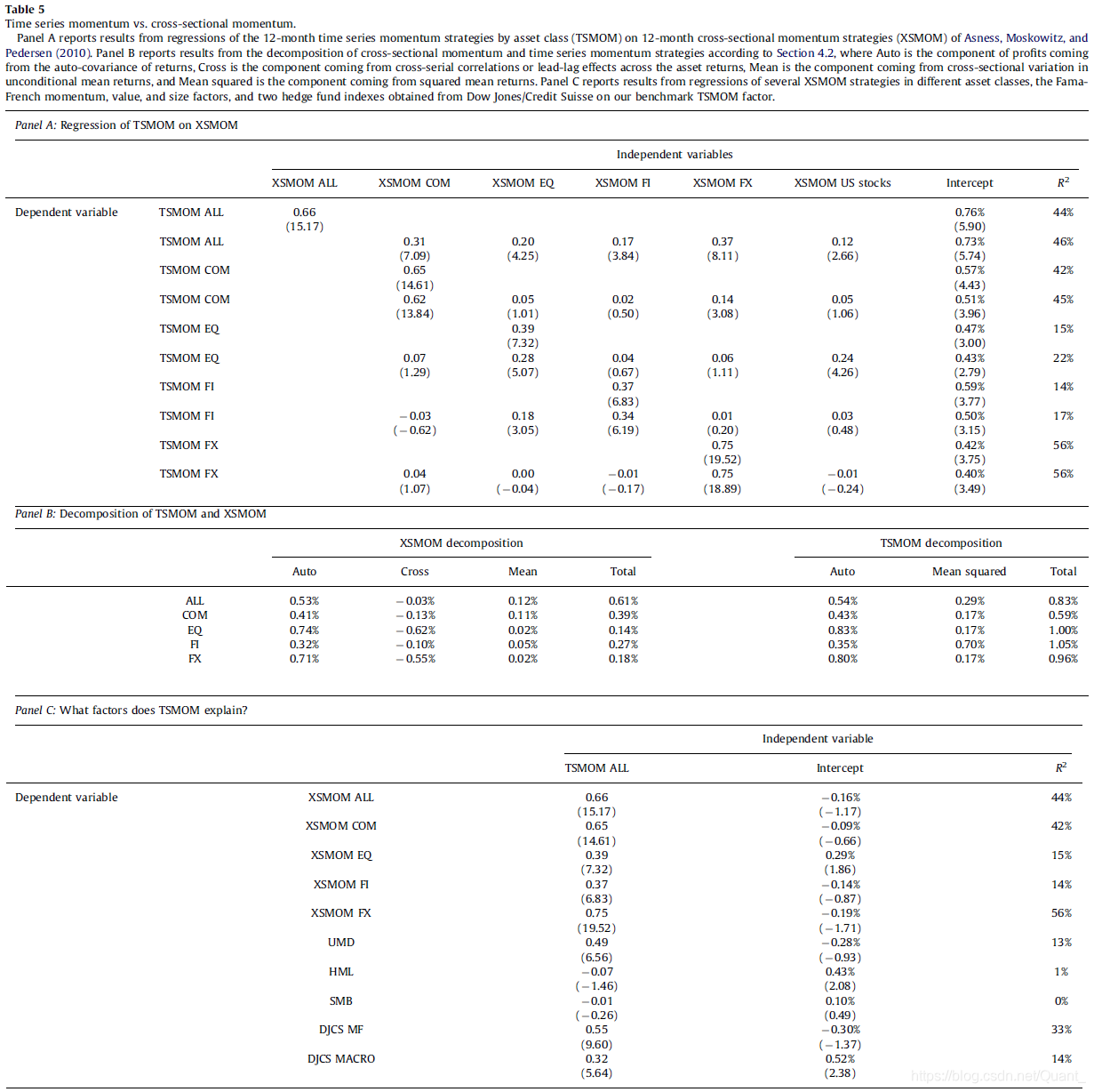 表 5 的 A 表展示了用传统截面动量因子(XSMOM)对时间序列动量因子(TSMOM)做回归的结果。第一行回归结果显示 TSMOM 和 XSMOM 高度相关,系数为 0.66,t 统计量为 15.17,R 方为 44%,但是截距依然有t统计量为5.90 的显著的每月 0.76%的 alpha 不能被 XSMOM 解释。所以说 TSMOM 和 XSMOM 并不完全一样。第二行将 XSMOM 收益分资产类别统计,并加入个股收益(该项不在TSMOM中)再对 TSMOM 总收益进行回归,发现每一项都能显著解释 TSMOM 总收益,但仍然留下了显著的不能解释的截距项。