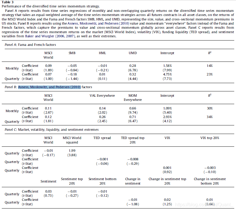 表 3 的 B 表展示了用 Asness, Moskowitz, and Pedersen (2010)的价值和动量因子代替 Fama-French 的因子的回归情况。这些因子也是截面因子。回归得到的结论与前相同,市场和价值因子依然不能显著解释时间序列动量,而截面动量可以解释时间序列动量但不能完全解释。