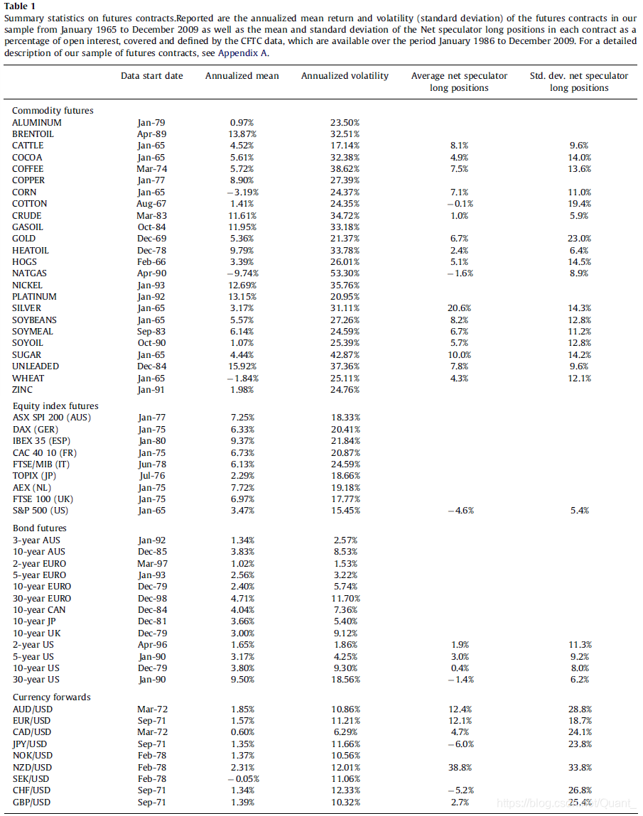 我们的研究范围包括 24 种商品期货,12 种外汇期货,9 种股指期货、13 种政府债券期货,研究样本期为 1965 年 1 月至 2009 年 12 月。这些是世界上流动性最好的期货合约。我们选用这些作为研究标的既是为了避免流动性不良和陈旧价格对结果的影响,也是为了使策略在大规模交易的背景下也可以实施。