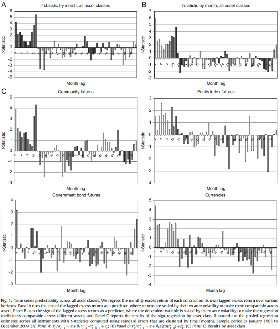 我们在对股指、货币、大宗商品和债券期货的 58 种流动性工具的过去 25 年数据的研究中,都发现了显著的时间序列动量效应,并且这种效应和传统截面动量不同,尽管二者具有相关性。时间序列动量因子在许多不同的资产内,都存在强力且持续的收益预测能力,并且对常用风险因子暴露很小,在极端市场下表现也很好,这些现象都对“随机游走”理论和理性定价理论提出了挑战。我们发现收益效应会持续 1 到 12 个月,而在更长的时间会逐渐发生反转,这与情绪理论提出的初期的反应不足和延迟的过度反应相一致。通过对投机者和对冲者交易行为进行分析,我们发现投机者可以通过时间序列动量效应从对冲者身上获利。