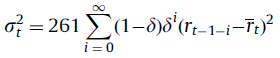 式中系数 261 表示年化,权重(1-δ)δi 之和为1,rt 是指数加权平均收益,系数 δ 使得: