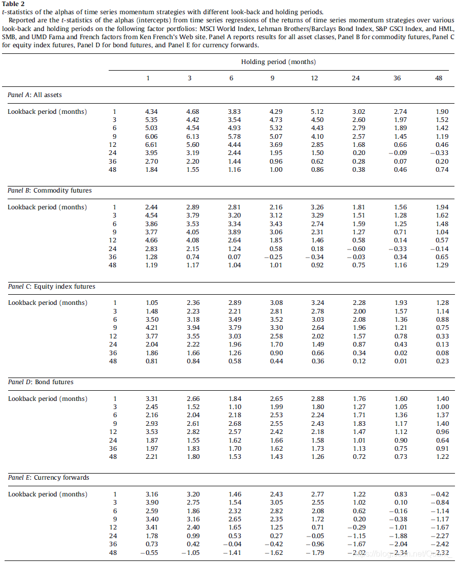 表 2 展示了计算出的单个资产和全资产 alpha 的 t 统计量。时间序列动量效应在各个维度上都显著存在于全资产类别,特别当回顾期和持有期为 12 个月以内时最为显著。