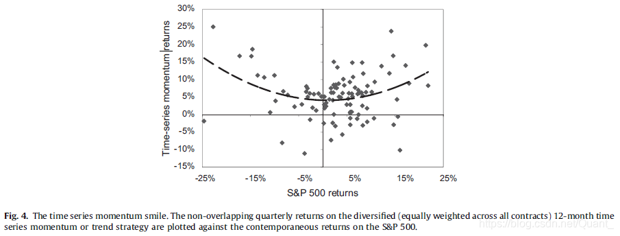 图 4 画出了 TSMOM 相对于标普 500 指数的收益情况。我们发现,TSMOM 的收益在市场上涨或下跌最大的时候达到最大值。为了测试这个发现的统计上的显著性,表 3 的 C 表展示了 TSMOM 收益相对于市场收益及其平方的回归情况。显然市场收益本身的系数并不显著,而市场收益的平方具有显著正系数,这也印证了我们的发现。