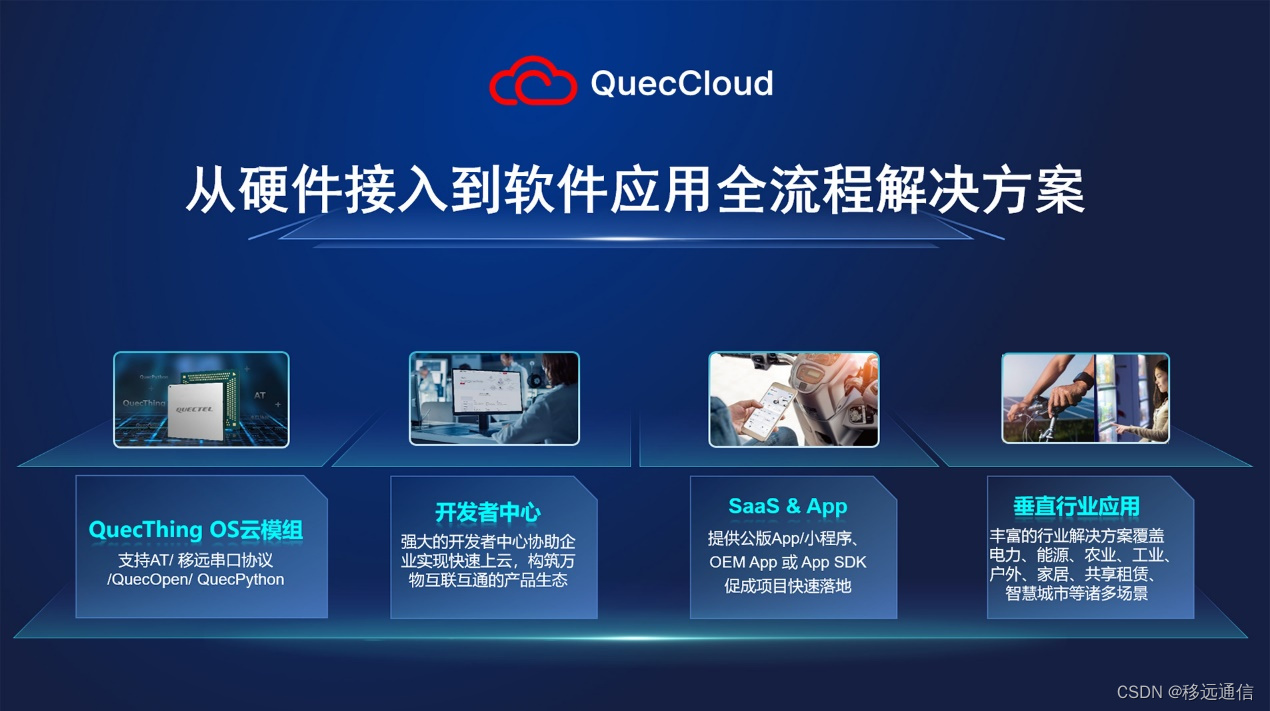 4月12日,在“万物智联·共数未来”移远通信物联网生态大会上,移远通信宣布正式推出其物联网云服务——QuecCloud。QuecCloud具备智能硬件开发、物联网开放平台、行业解决方案三大能力,可为开发者和企业用户提供从硬件接入到软件应用的全流程解决方案,助力行业客户快速实现智能化升级和商业化落地。