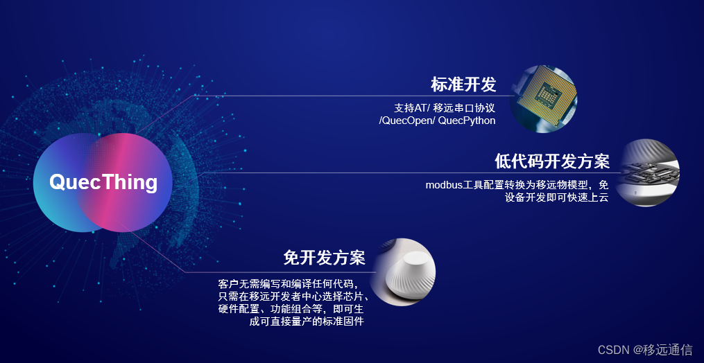 与此同时,移远还提供丰富的AT指令、移远串口协议以及简洁易用的接口,并开放通信模组空间,可提供QuecPython、QuecOpen、MCU SDK等多种自助接入的方式,从而帮助客户快速开发硬件程序,加速行业的智能化进程。