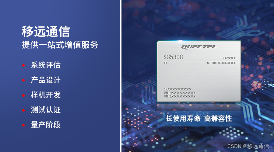 移远不仅提供性能出众的SG530C-CN模组,还打造了一站式增值服务,在更大程度上帮助客户节省终端开发时间和成本。该增值服务涵盖从系统评估、产品设计、样机开发、测试认证到量产阶段的开发全流程,也可根据客户需要,对行业功能和算法进行开发与定制,优化相关性能,基于模组定制客户 PCB 主板,基于芯片定制客户 PCB 主板,以及深度定制软件功能等。
