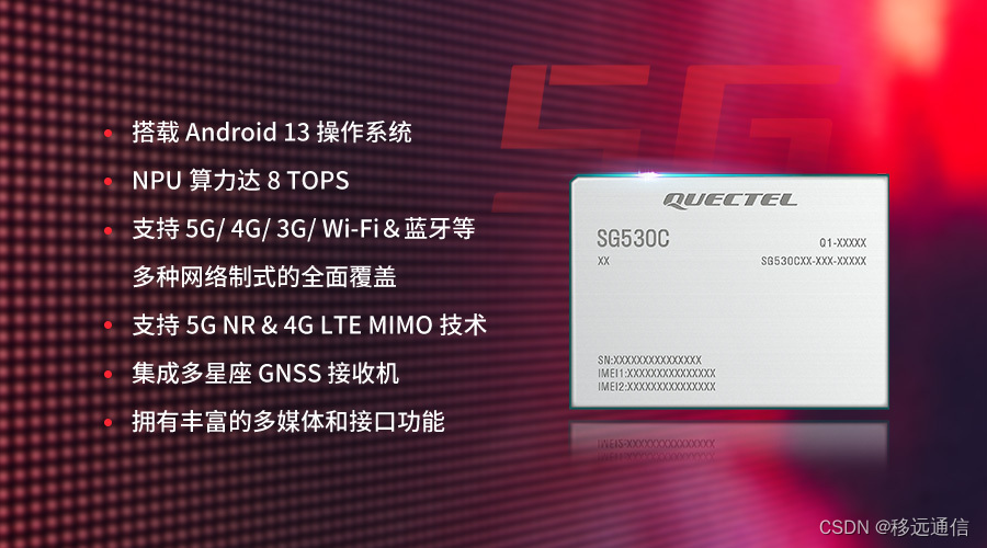 基于紫光展锐P7885 5G行业方案SoC平台开发的移远通信SG530C-CN模组,在网络连接方面能力出众。该模组符合3GPP Release 15标准,除了支持 5G NSA 和 SA 模式外,还向下兼容 4G/ 3G 网络,同时支持Wi-Fi、蓝牙等多种网络制式,使客户终端在无线接入上更具灵活性,能满足室内、户外、工业等不同环境下的通信需求。