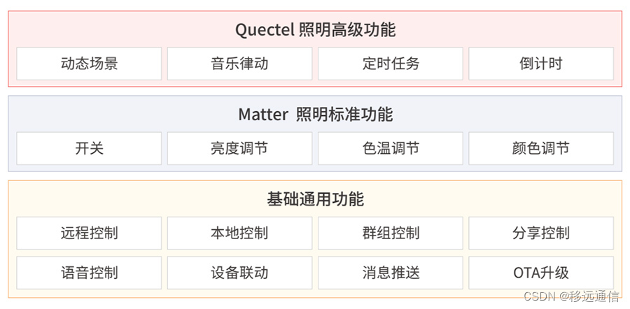 作为家居中数量最多、涉及区域最广的照明设备,Matter的出现解决了照明产品最基础的标准化功能定义,让不同品牌的设备能够在一个协议下被统一操控。而移远通信则是在此基础上,结合当代人居的特殊需求,对不同场景的产品功能和优势进行了深度开发,从基础通用、标准功能、高级功能三大层面全面升级。