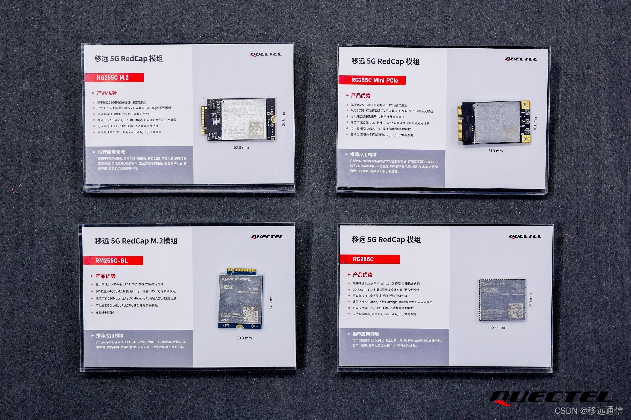 此次展会,移远通信带来了其多款不同封装的RedCap模组,包括RG255C、RG255C M.2、RG255C Mini PCIe、RM255C-GL等,多样化的型号和封装方式便于客户根据自身需求,进行灵活选择。