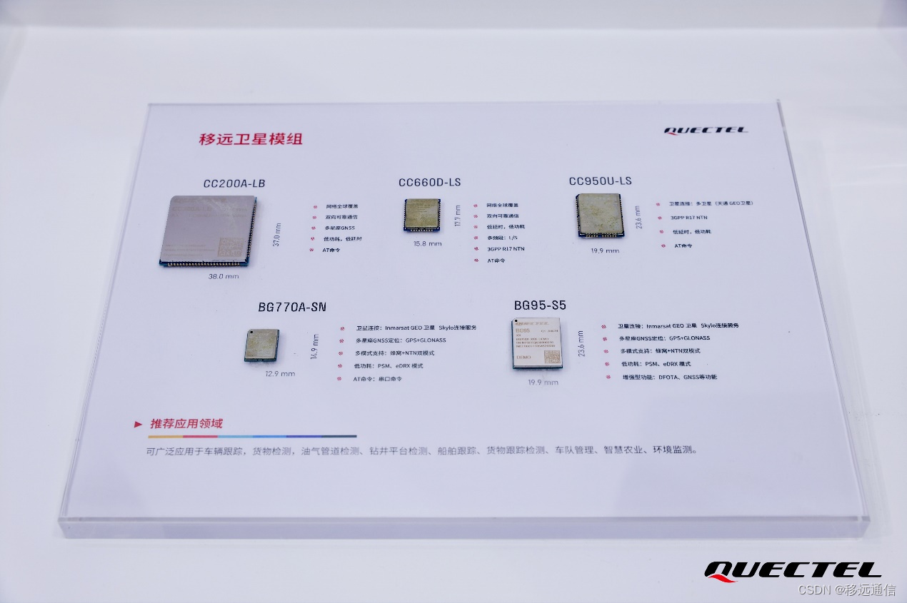 在卫星通信领域,基于不同平台,移远通信开发了多款卫星通信模组产品,为用户带来更加可靠的全球连接。有搭载ORBCOMM的卫星物联网连接平台的CC200A-LB,可搭配蜂窝模组使用,助力打造“卫星+蜂窝”双模连接的物联网应用;有基于紫光展锐首颗卫星通信SoC芯片V8821开发的CC950U-LS,具有低延时、低功耗、双向数据传输等优势;有拥有广覆盖、多频段、双向通信、低时延、低功耗等多重优势的CC600D-LS;还有直接支持“卫星+蜂窝”双模网络的BG95-S5。