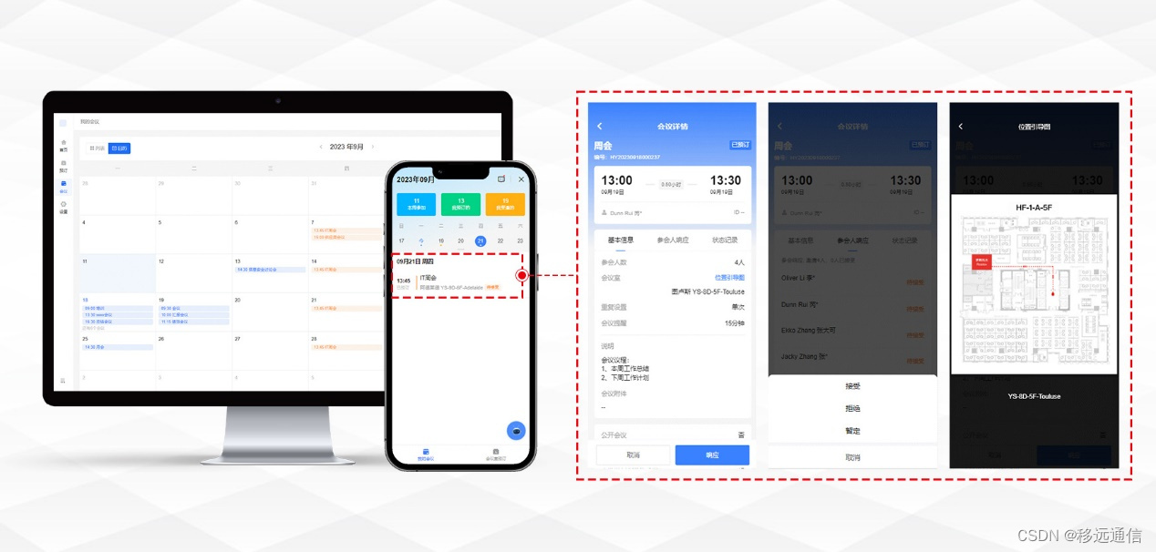使用移远通信Qrooms智能会议室解决方案的用户,可任意选择PC段或移动端两种方式进入系统,查看全公司范围内的会议室可用时间段、可用设备、限制人数等信息条件,再通过智能运算筛选符合自我需求的会议室,随后快速进行会议室预订、确认。
