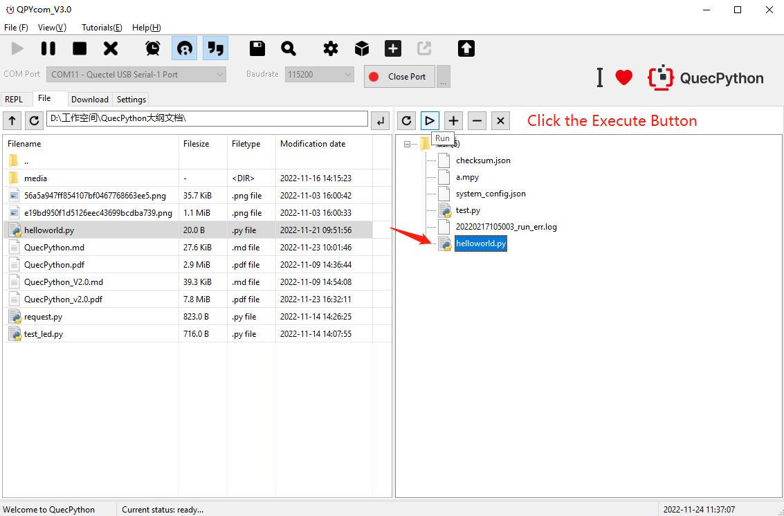 或者通过QPYcom文件页面 执行 按钮执行脚本文件,在工具的文件页面选择要执行的脚本文件然后点击 "▷"按钮
